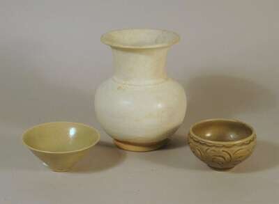 Comprising a white glazed ovoid vase, carved celadon bowl and a light celadon glazed conical bowl.
