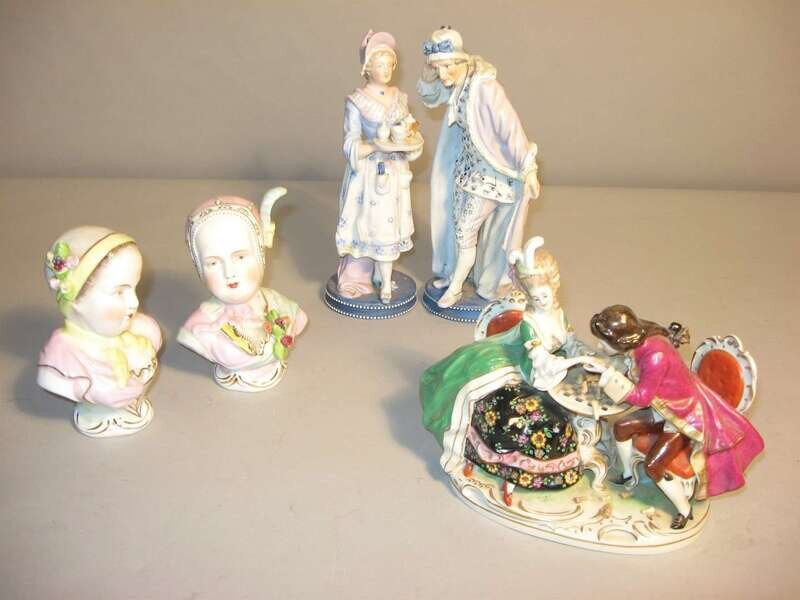 Comprising a couple playing chess, a pair of busts of children, an elderly gentleman and a woman serving tea. (5).