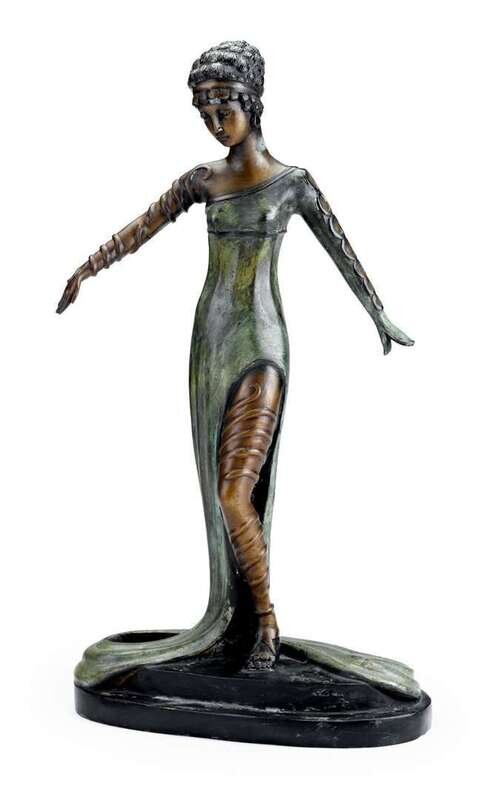 White metal, green and brown patinas, modeled as woman in Grecian style dress, inscribed to base '1936 / Icart'.