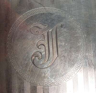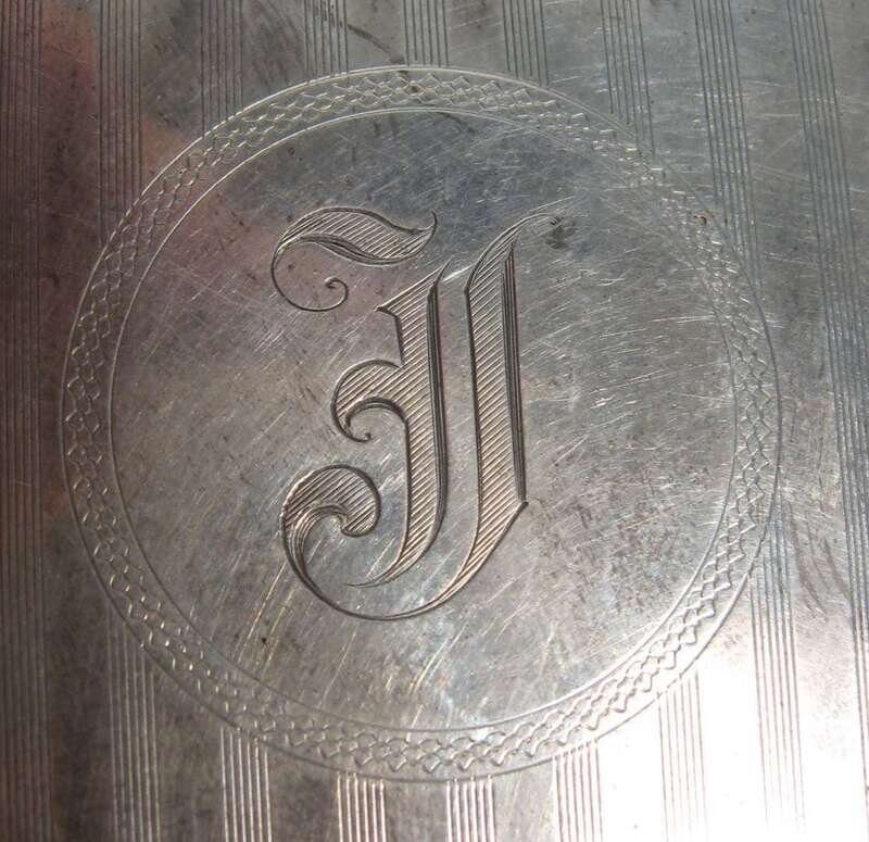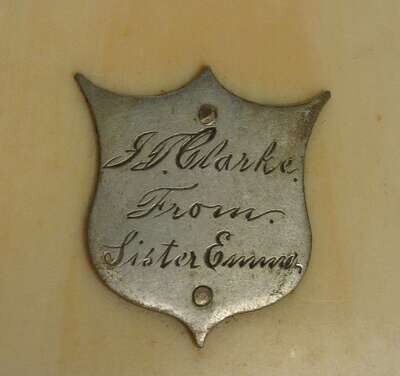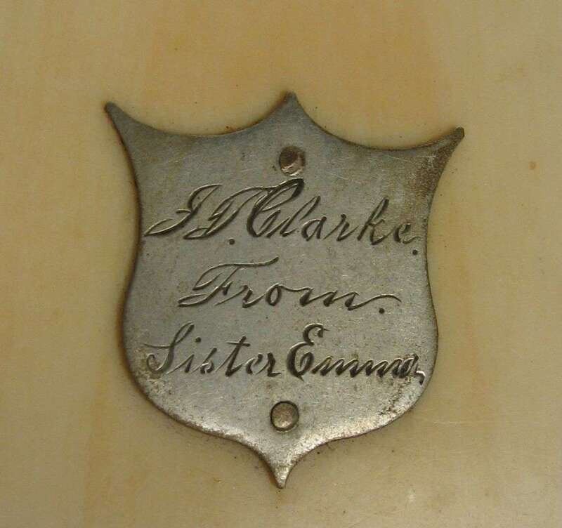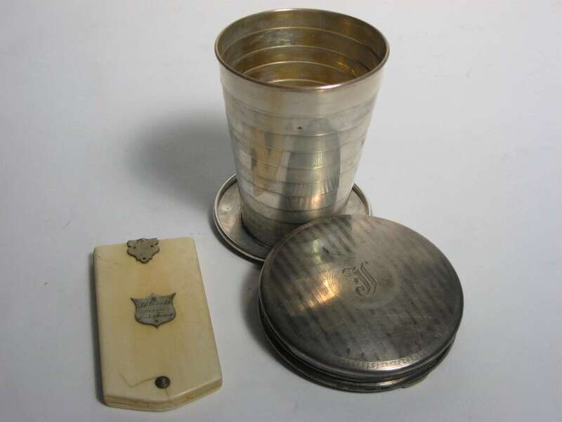 Rectangular in shape with silver shield to lid inscribed : "J.d.. Clarke from Sister Emma" together with a sterling silver folding cup.
