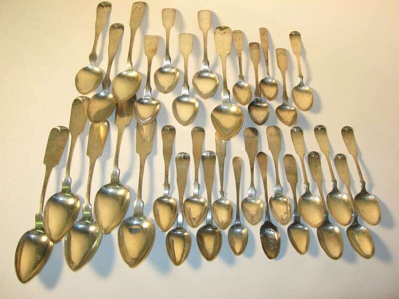 Typical fiddle handles inscribed Harris", together with a collection of dessert and tea spoons of the same period, 38 pieces.