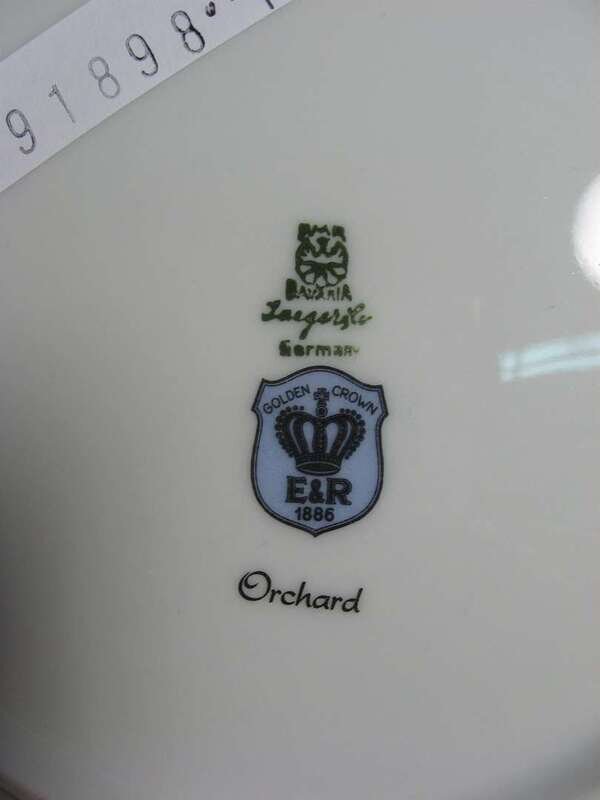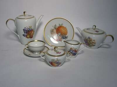 comprising of eight cups, eight saucers, eight plates, creamer, sugar with cover, tea pot, coffee pot, all decorated with fruit design (28).