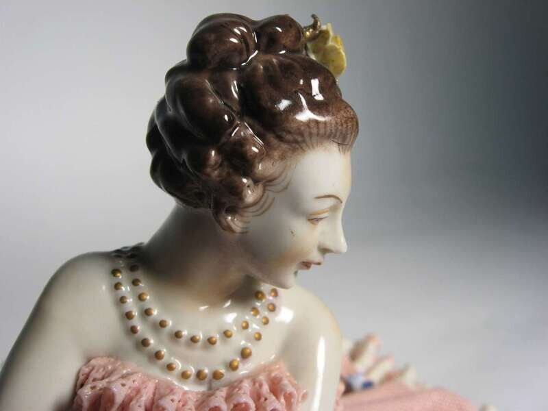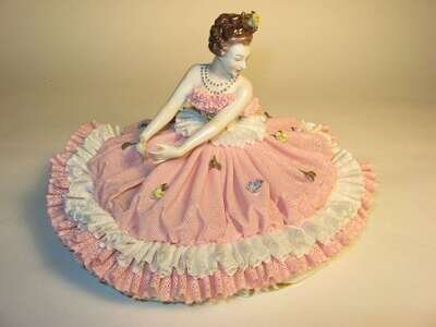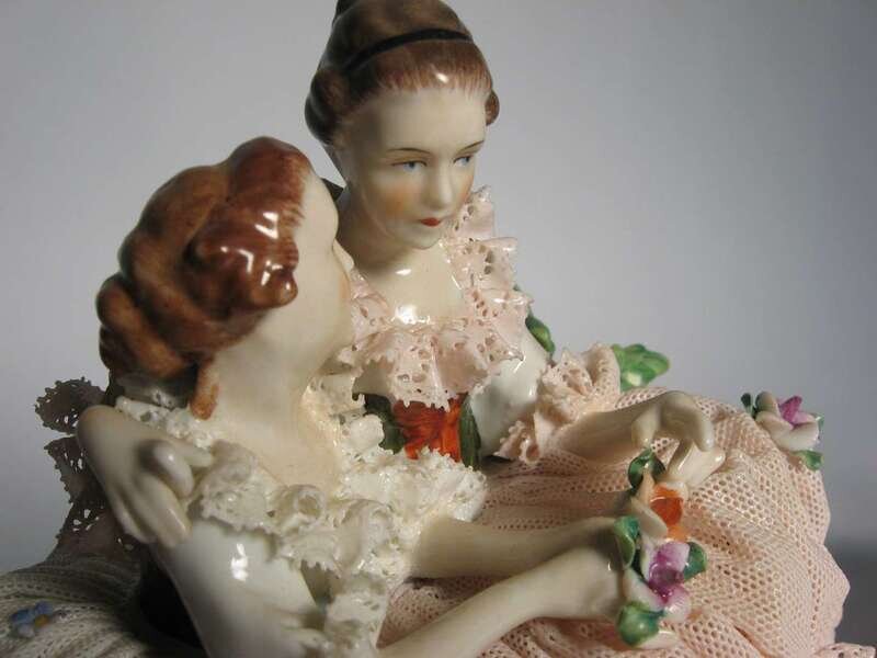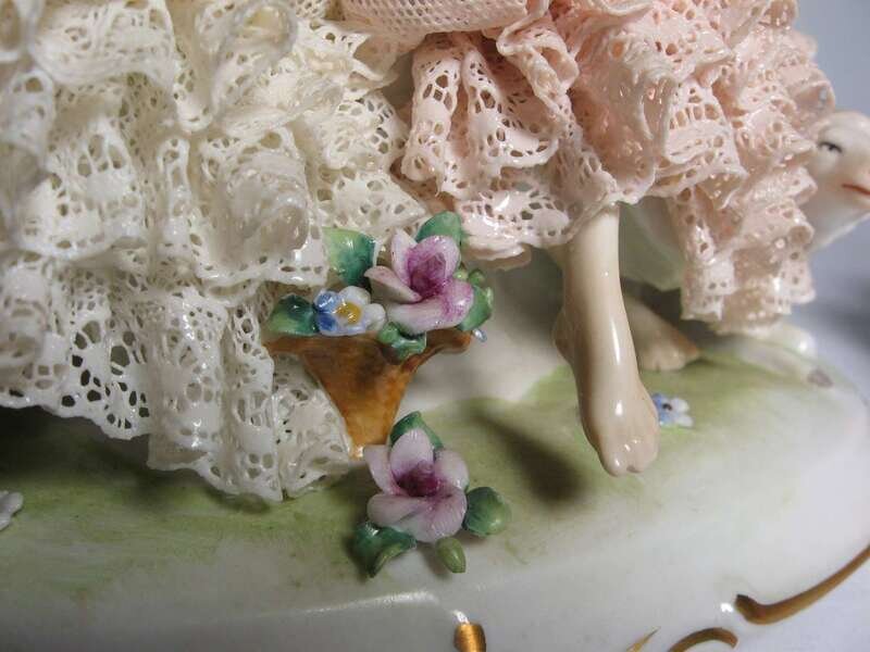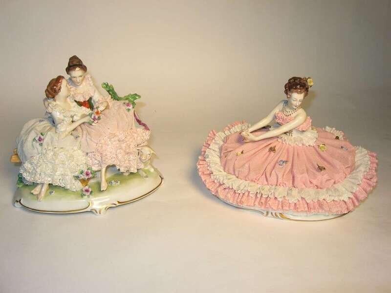 Including of one figure of a ballerina together with a figurine of two young seated ladies in a garden landscape setting.