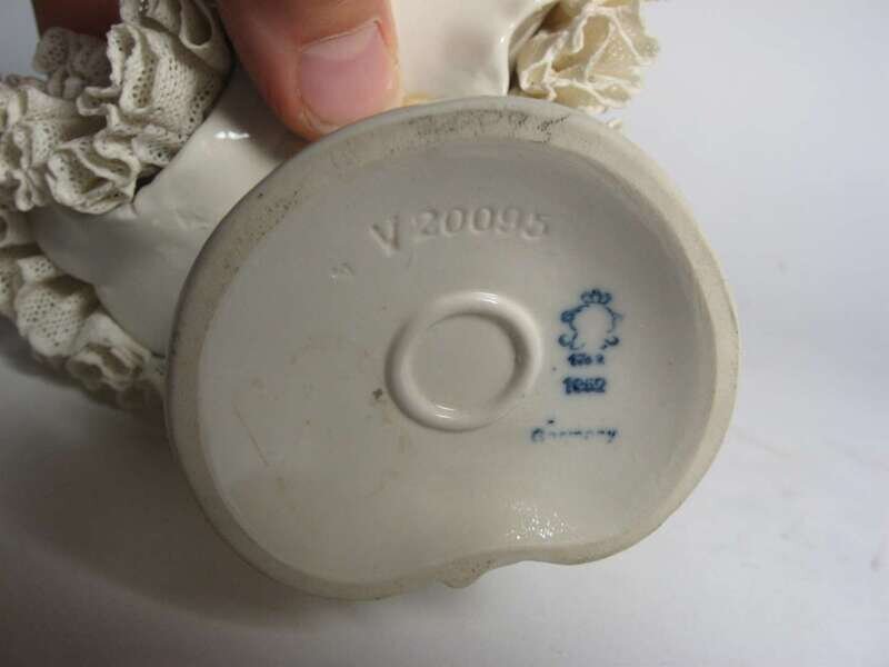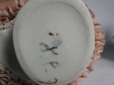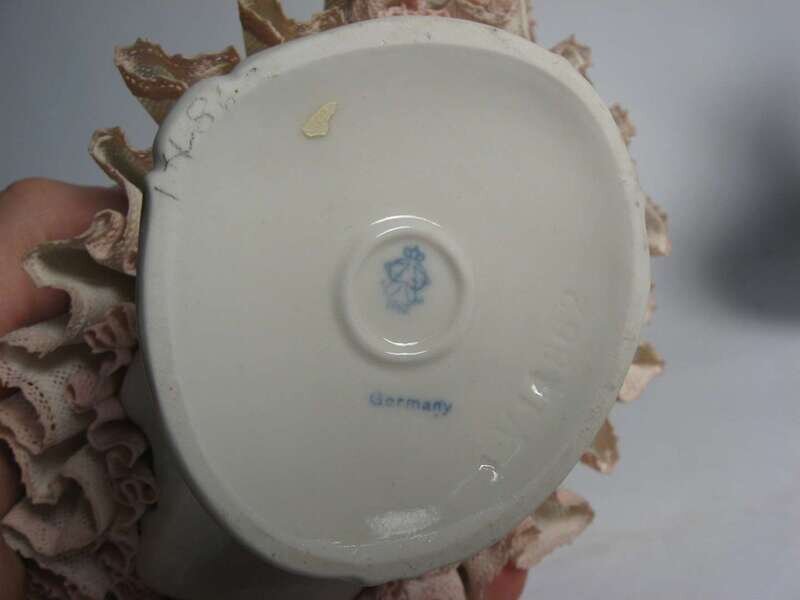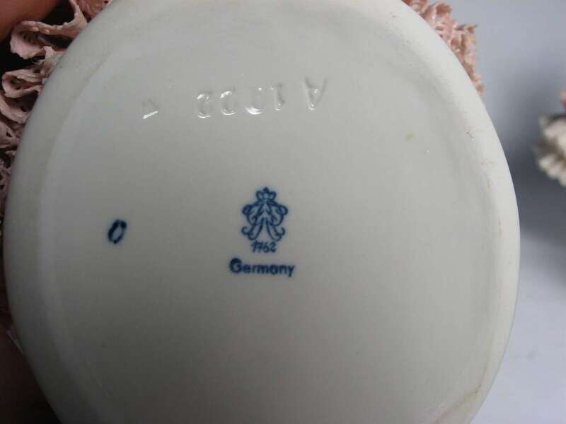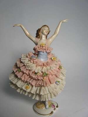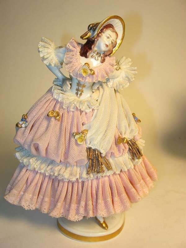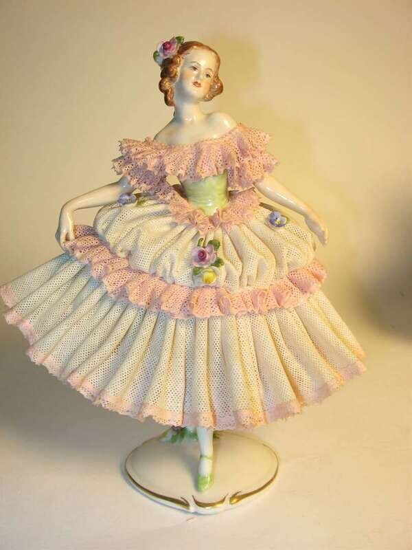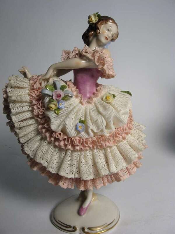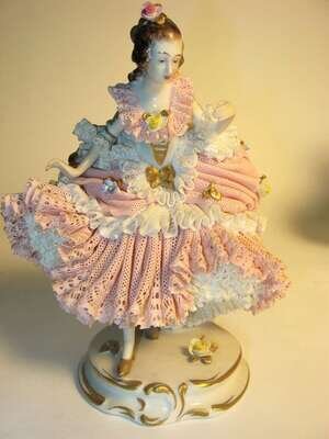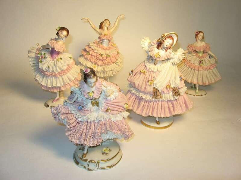 All dressed in pink and white lace and applied floral details, standing on raised plinth bases.