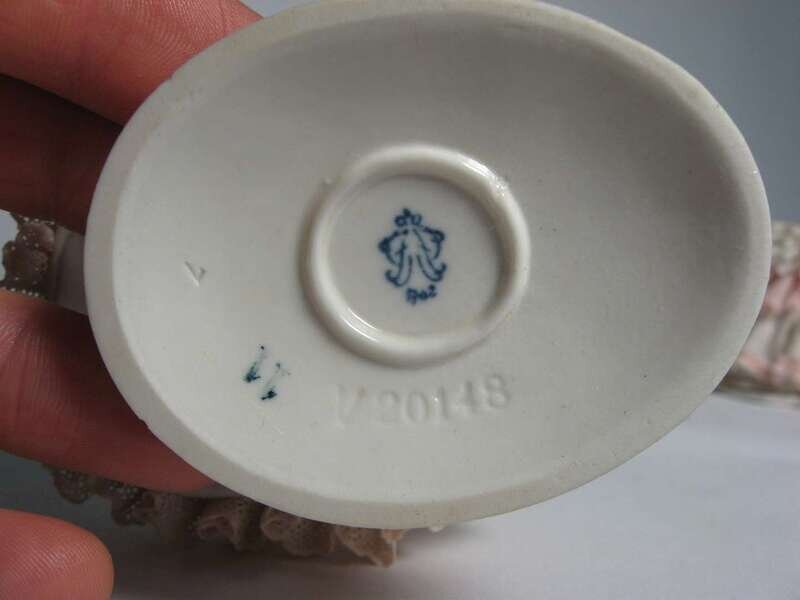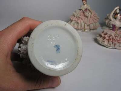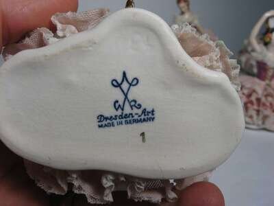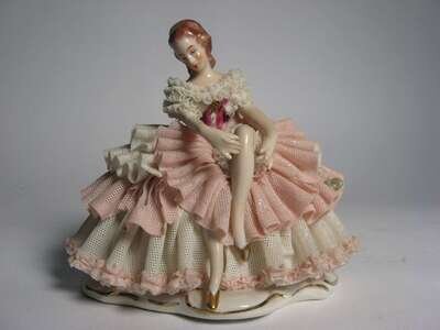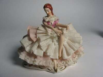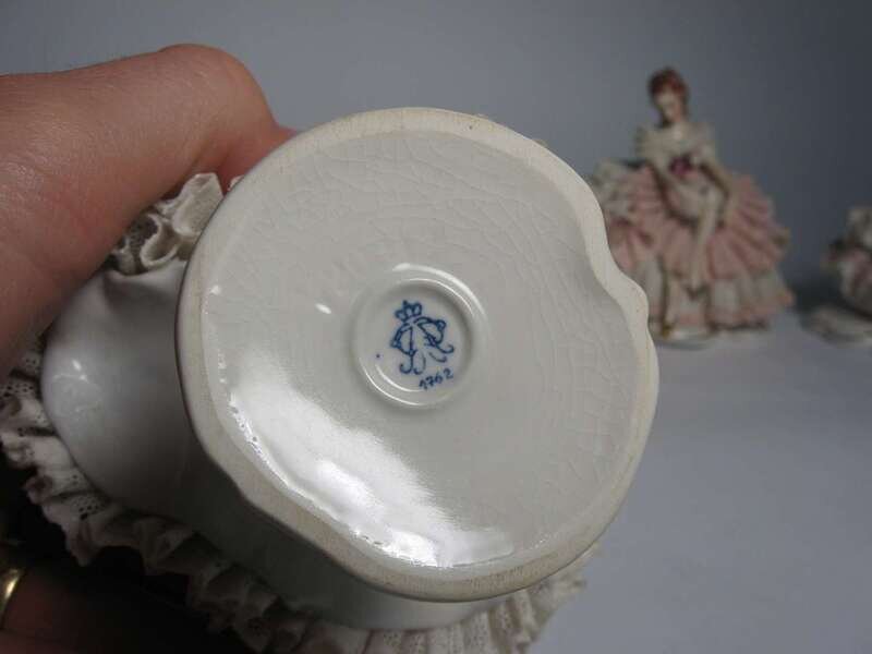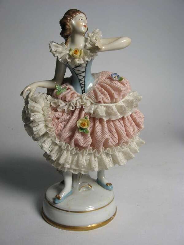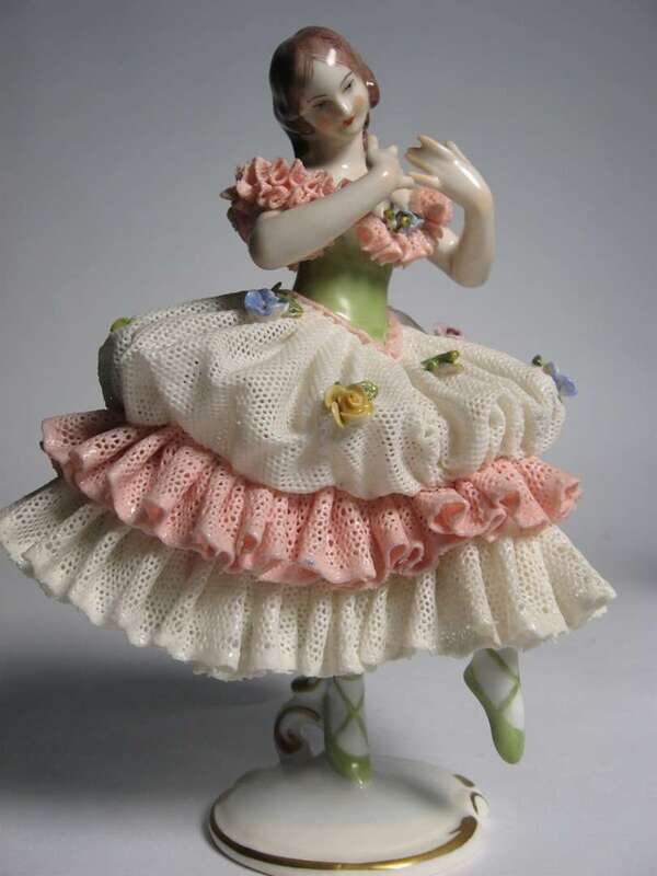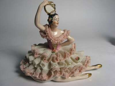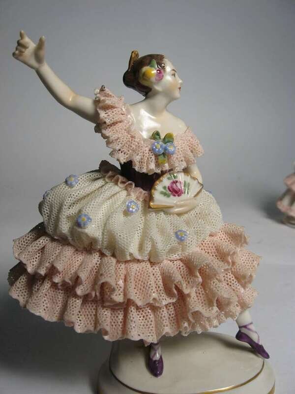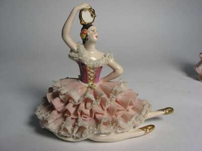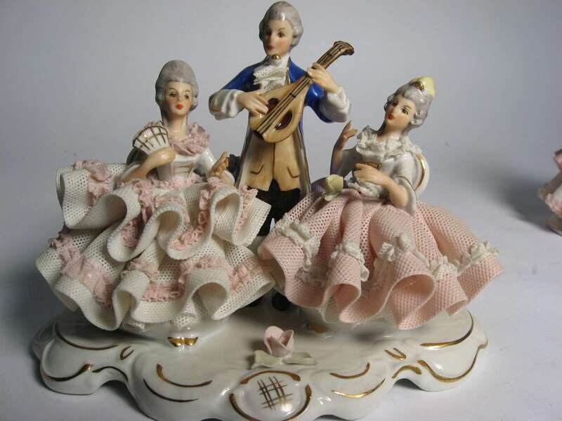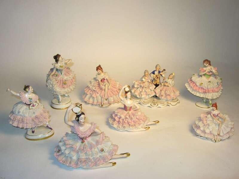 Including seven ballerina figures with lace and applied floral dresses together with a porcelain group with two ladies and a musician.