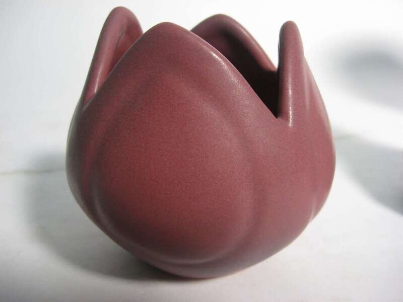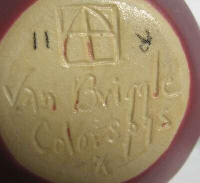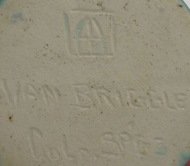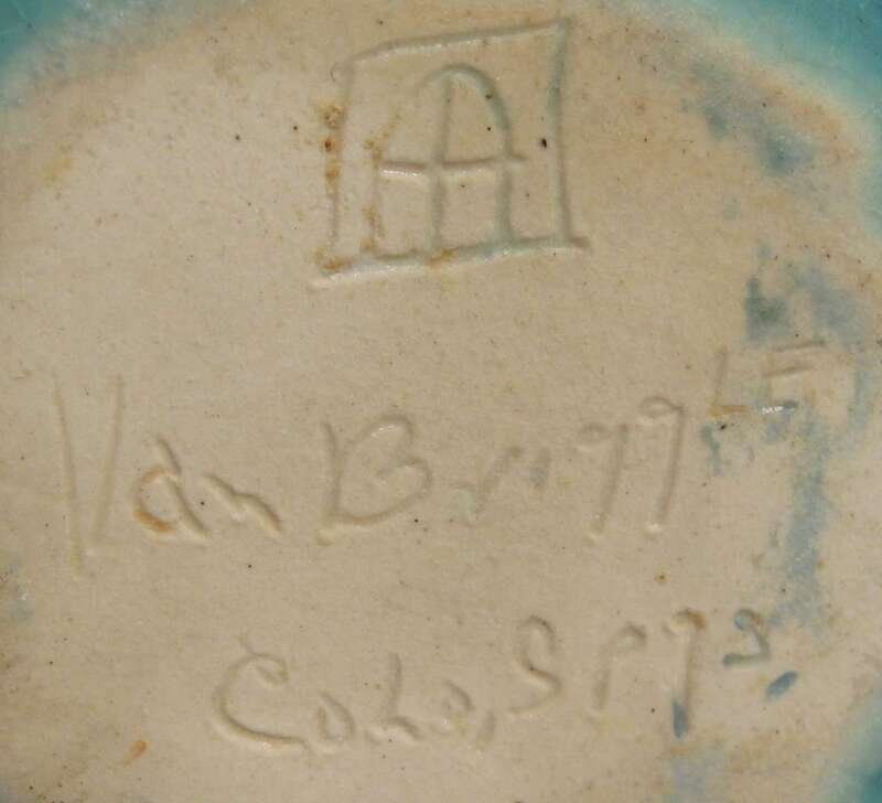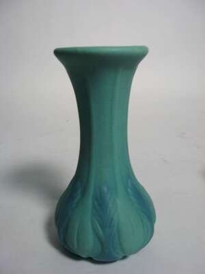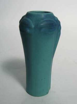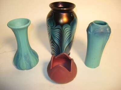 Lavender and celadon and blue glaze to Van Briggle vases, signed on bottom, the art glass vase with blue floral decoration on brown field.