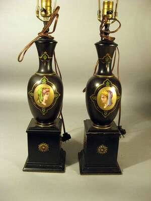 Each of baluster form with oval portrait medallions on a black ground, raised on stepped wooden bases; now mounted as lamps. (2).