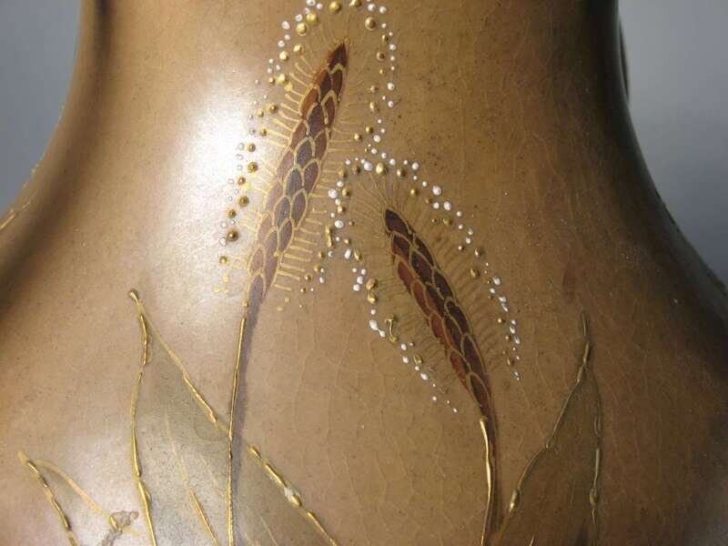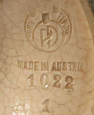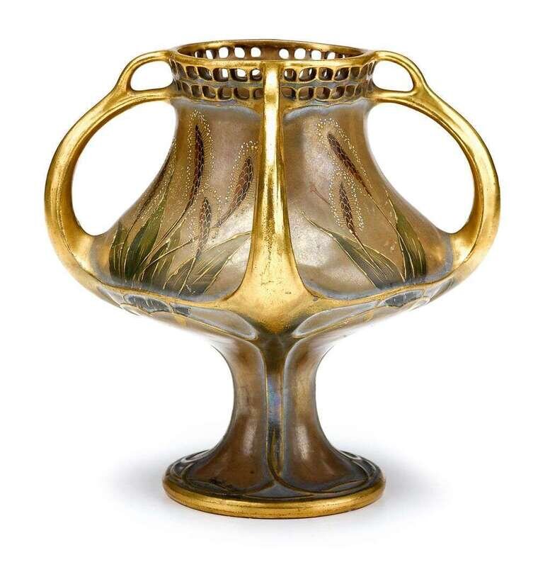 The pierced rim leading to four gilt loop handles and a body painted with bullrushes, raised on a circular foot, impressed 'Turn Teplitz 'PD' Made in Austria/ 1022'.