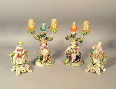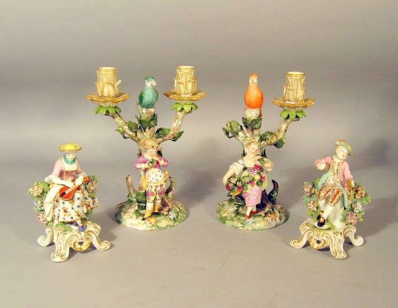 The first pair modeled as a gallant and companion seated amongst foliage with musical instruments, probably Samson, red anchor marks; and a pair of German porcelain figural candelabra. (2).