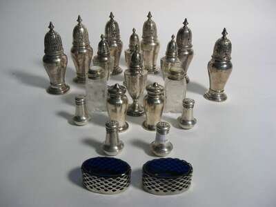 Faithful copies of a set by Richard Freeman, together with a set of four salts and peppers and odd salts and peppers, 20 pieces.