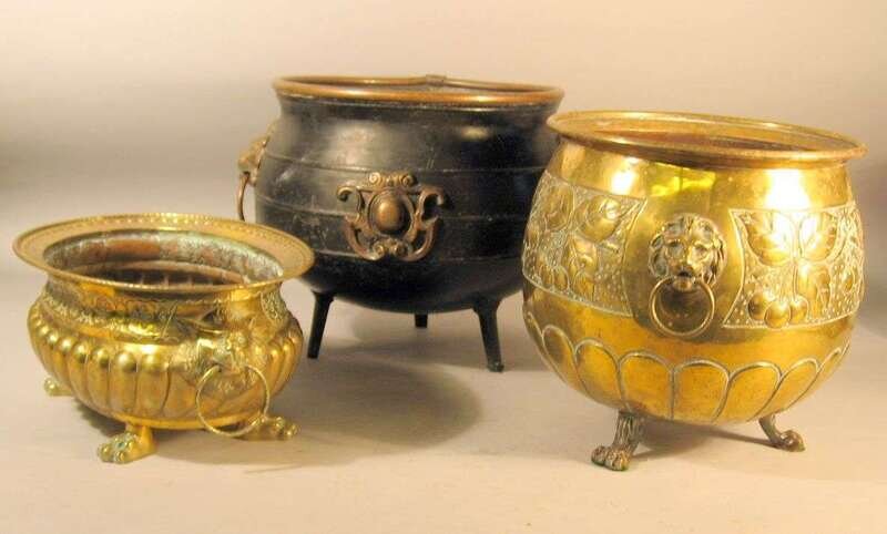 Oval, with a lobed body and lion's mask ring handles to the sides raised on paw feet; together with two other brass jardinieres. (3).