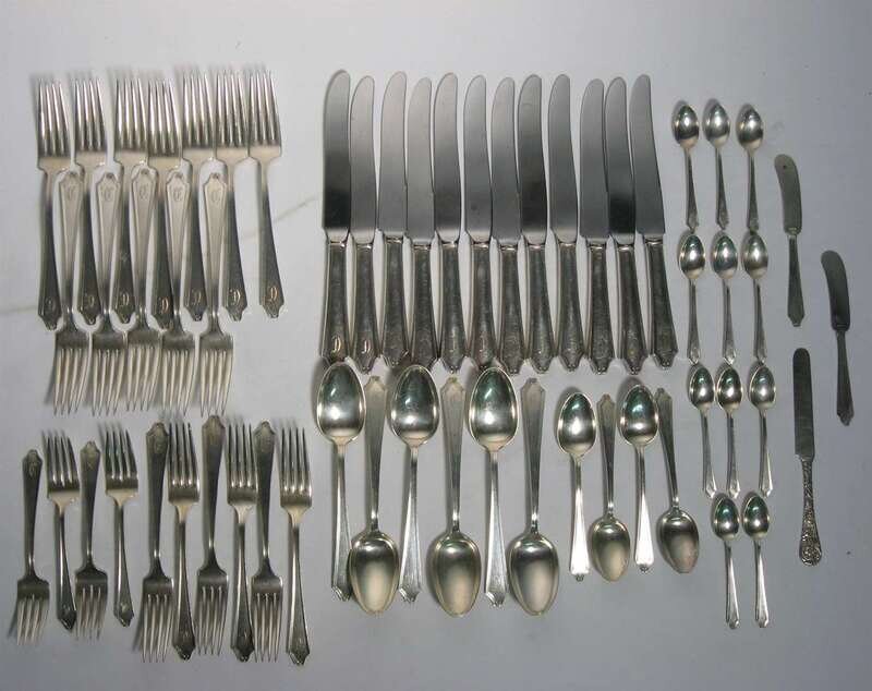 "Minuet" pattern including twelve dinner knives, twelve dinner forks, six cream soup spoons, six luncheon forks, four salad forks, four teaspoons, two flat butter spreaders and eleven demi-tasse spoons 57 pieces.