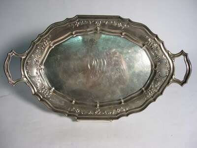 Oval serpentine shape with molded angular handles and border, leaf and floral repousse border.