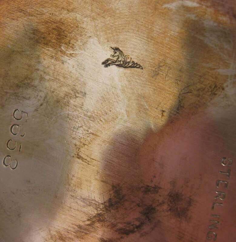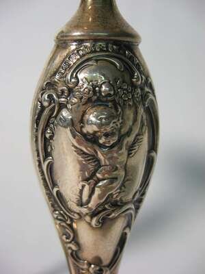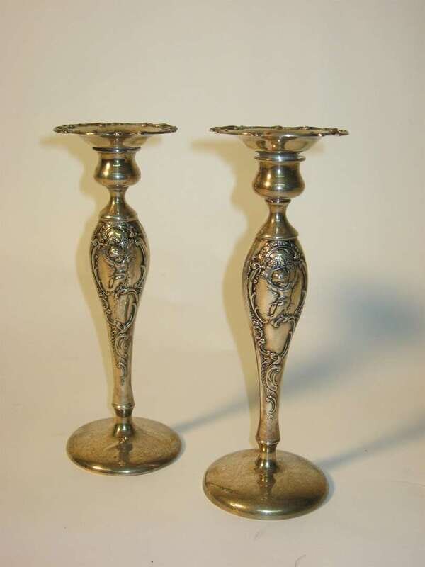 Circular serpentine bobeches, slender pear shape shafts with repousse cupid decoration.
