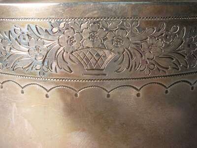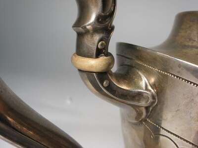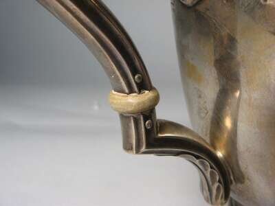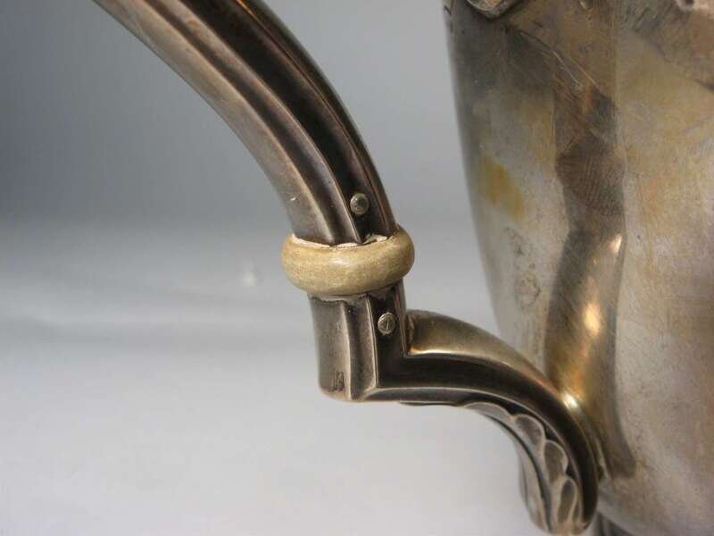 Pineapple finial to lid, leaf molded spout and "lyre" shaped handle, mid-band engraved with leaves and flowers.