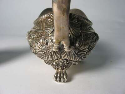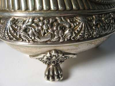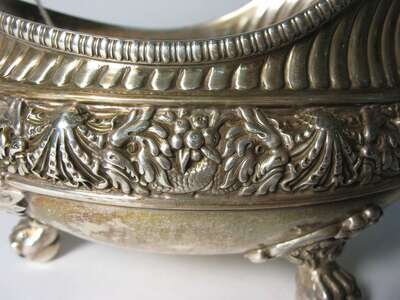 Oval with thin gadrooned border, with reeding below repoussé shell, floral and leaf mid-base leaf. cast "lyre" handles on cast leaf & scroll mounted claws and ball feet #7148M6437.