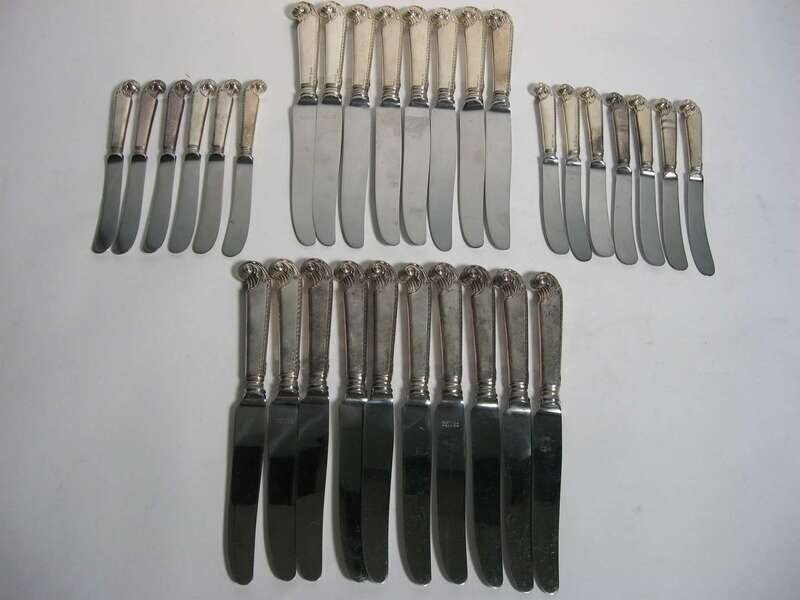 Scroll and leaf chased handles, feathered edges, steel blades, including eight dinner, ten luncheon and thirteen butter spreaders.