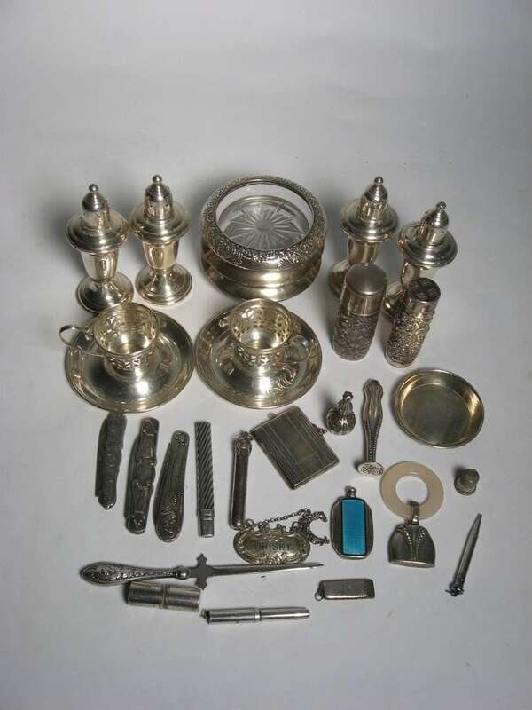 Coasters, salt and pepper shakers, penknives, rattle, pencils, demi-tasse cups and saucers (no liners), ladle etc. 33 pieces.