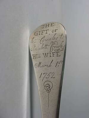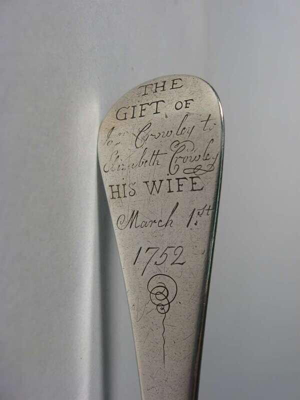 Oval handles, one by Elias Pelletreau, Southampton,NY and the other possibly by John Allen, Boston, the back of the handle inscribed "The gift of Jn. Crowley to Elizabeth Crowley, his wife, 1752.