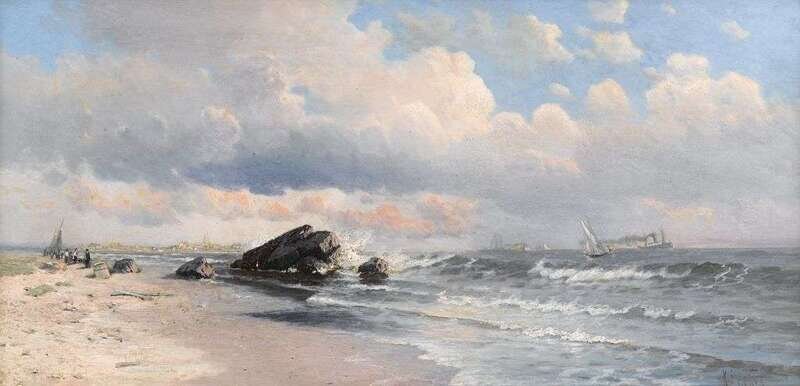 KARL EUGENE FELIX (AMERICAN 1837-1906) FIGURES ON A BEACH, SHIPPING, AND A TOWN IN THE DISTANCE