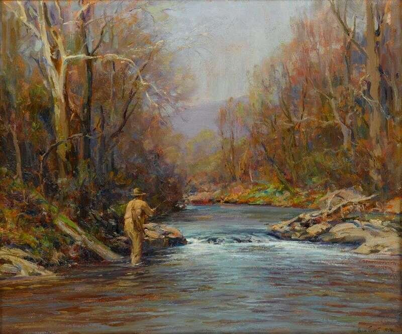 JOHN (JACK) FROST (AMERICAN 1890-1937) FLY FISHERMAN ON A RIVER
