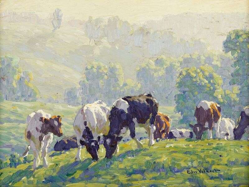 EDWARD CHARLES VOLKERT (AMERICAN 1871-1935) CATTLE GRAZING ON A SUN DAPPLED HILLSIDE