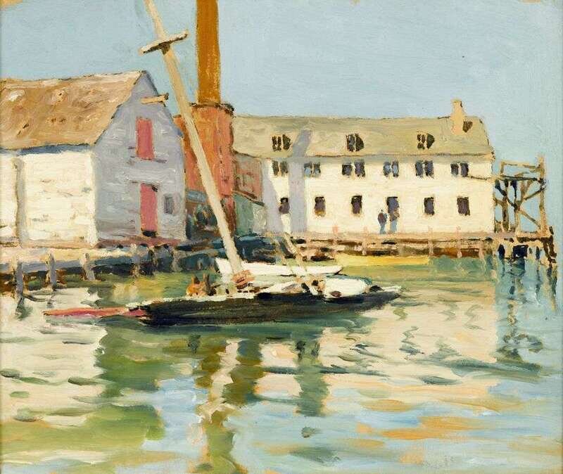 HENRY BAYLEY SNELL (AMERICAN 1858-1943) FISHING BOATS IN A SUNLIT HARBOR