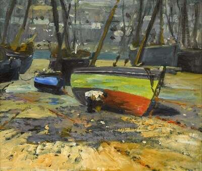 HENRY BAYLEY SNELL (AMERICAN 1858-1943) BEACHED FISHING BOATS