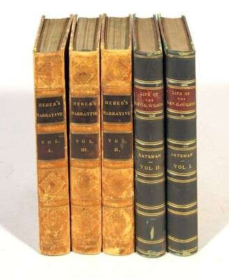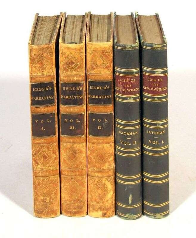 Indian Sub-Continent - Description, Travel & C: Heber, Reginald. Narrative of a Journey Through The Upper Provinces of India,... 1824-1825 (With Notes Upon Ceylon). London: John Murray, 1828. 3rd ed. 3 vols. 8vo, contemp. gilt-ruled & heavily blind-stamped & ruled red cloth, richly gilt spine compartments, black morocco spine labels, marbled edges; joints rubbed, spines & edges heavily scuffed, spines faded to brown. With 27 wood-engraved plates. Scattered, mostly light, foxing, occasional staining in margins of vol. 1. * Bateman, Josiah. The Life of The Right Rev. Daniel Wilson..., Late Lord Bishop of Calcutta and Metropolitan of India. London: John Murray, 1860. 1st ed. 2 vols. 8vo, contemp. 1/2 green calf & marbled bds., gilt-ruled & lettered spines, maroon morocco spine labels; occasionally scuffed. With map, frontis. portraits + 20 plates. Moderate foxing & darkening to title pages, frontispieces & other front matter, other scattered light foxing.