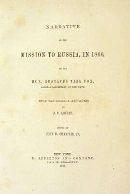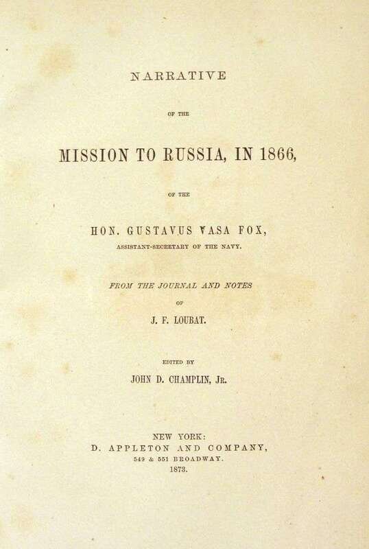 Loubat, J.F. Narrative of The Mission to Russia, in 1866, of Hon. Gustavus Vasa Fox, Assistant-Secretary of the Navy. New York: D. Appleton, 1873. First edition. 4to, contemp. 3/4 brown morocco & pebbled cloth, richly gilt spine compartments, marbled edges & endpapers; scuffed, spine ends & corners & joints rubbed. With 18 steel-engraved plates - primarily portraits. Minor foxing to front matter.