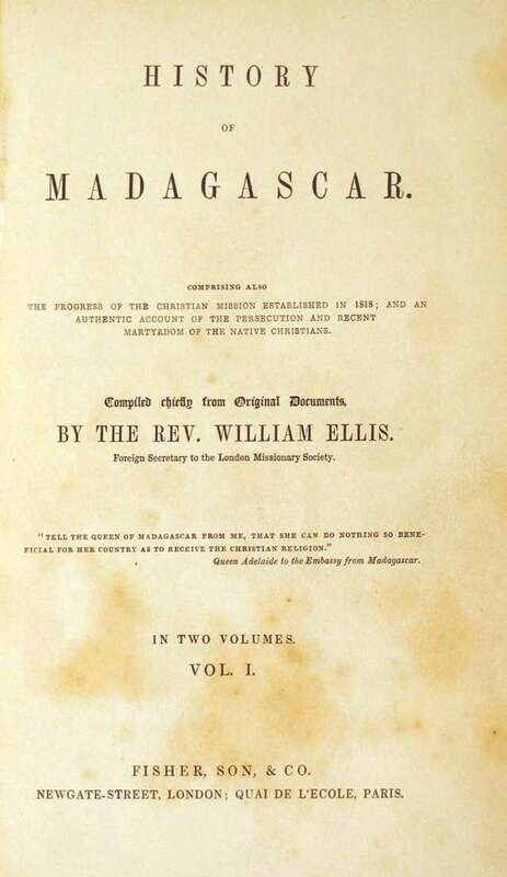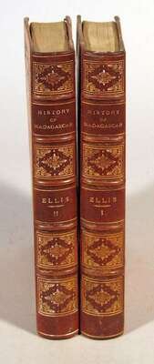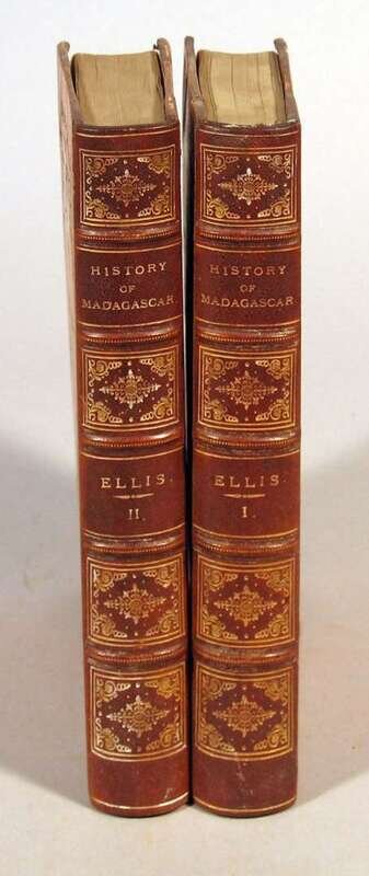 Ellis, William. History of Madagascar. London: Fisher & Son, [1838]. 8vo, late 19th-Century 3/4 brown morocco & marbled bds., spines gilt, t.e.g.; occasionally bumped & scuffed. With map, plan, 10 plates (incl. color frontis. in vol. 2), wood-engraved text illus. Scattered light foxing, occasional minor marginal dampstaining.