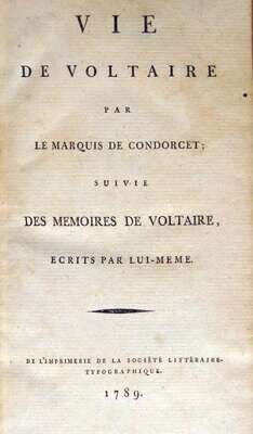 Condorcet, (Antoine-Nicolas de.) Vie de Voltaire. [Paris]: Societe Litteraire-Typographique, 1789. 8vo, contemp. bds., calf back & corners, red morocco spine label. Generally internally crisp & clean - very scattered light foxing. Complete with additions & corrections.
