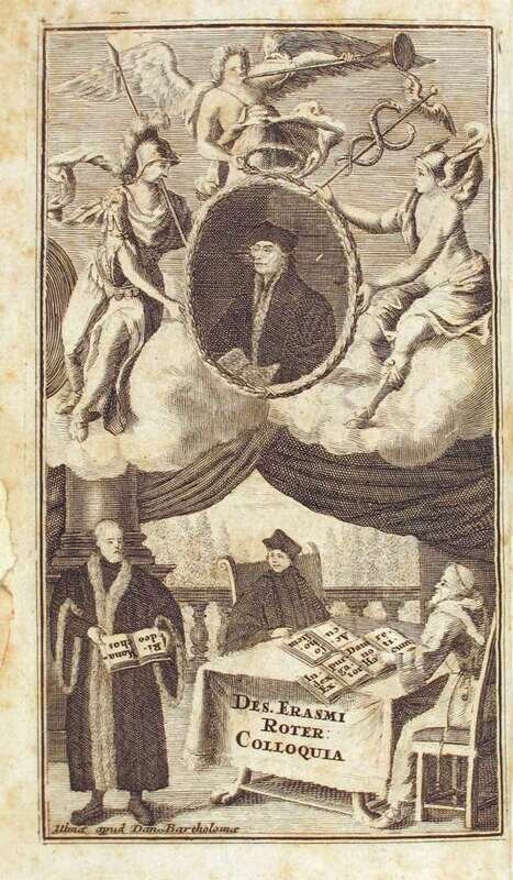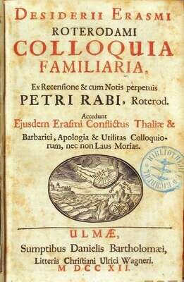 Erasmus, Desiderius. Colloquia Familiaria. Ulmae: Danielis Bartholomaei, 1712. Edited by Petri Rabi. 8vo, contemp. sheep, gilt floral spine compartments, mustard morocco spine label, all edges stained red. With Erasmus's Moriae encomium with sep. title page & pagination. Frontis. (chip along fore edge margin). Scattered light to moderate foxing. Ex-library - ink stamp on title.