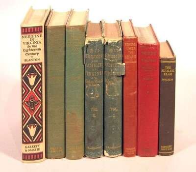 The American South - History & C - Much relating to Virginia: Meade, Bishop (William). Old Churches, Ministers and Families of Virginia. Philadelphia: J.B. Lippincott, 1861. 2nd ed. 2 vols. Lg. 8vo, orig. green cloth, gilt-lettered spines; spines & corners worn & chipped. Frontis., plates, text illus. Some internal dampstaining. Ex-library - stamps & markings on endpapers. Sabin 47420. * Wertenbaker, Thomas J. Virginia under The Stuarts, 1607-1688. Princeton Univ. Press, 1914. 8vo, orig. gilt-lettered maroon buckram, gilt-lettered spine, t.e.g.; corners bumped, spine ends frayed, occasionally scuffed. * Blanton, Wyndham B. Medicine in Virginia in The Seventeenth Century. Richmond, 1930. Sm. 4to, orig. gilt-lettered red cloth; occasionally scuffed. Plates. * _ _. Medicine in Virginia in The Eighteenth Century. Richmond, 1931. 4to, orig. color pictorial cloth; light wear. Plates. * Gray, Lewis C. History of Agriculture in The Southern United States. 2 vols. Tall 8vo, orig. green cloth; light wear. Minor discoloration to endpapers. Maps & tables in text. * Mecklin, John Moffatt. The Ku Klux Klan. New York: Harcourt Brace, 1924. 1st ed. 12mo, orig. black cloth; some edge wear.