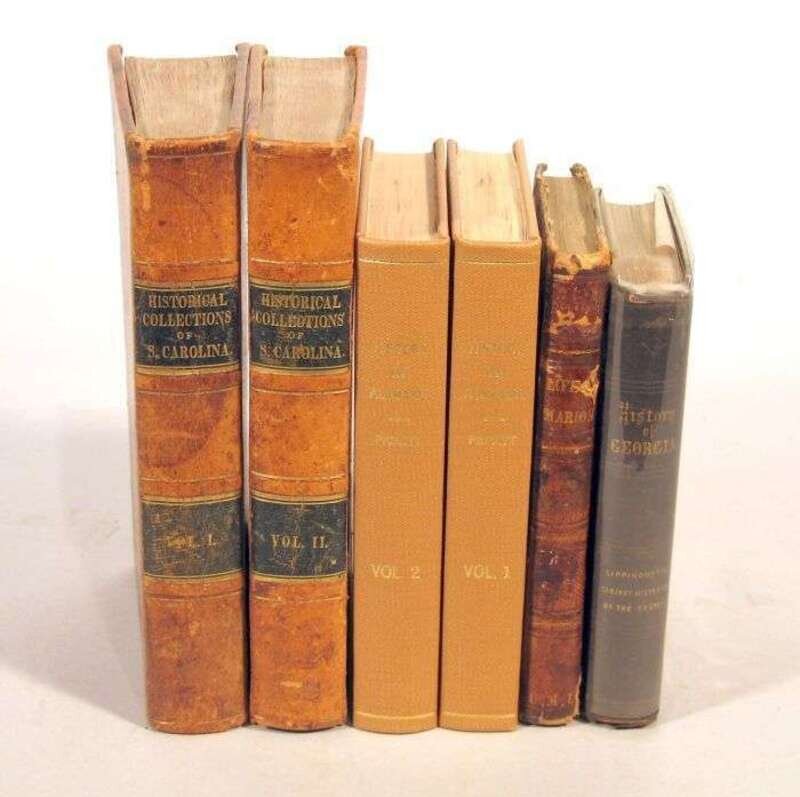 American South - Georgia, South Carolina, Alabama & Mississippi: Carroll, B.R., compiler. Historical Collection of South Carolina. New York: Harper, 1836. 1st ed. 2 vols. 8vo, contemp. sheep, black morocco spine labels; scuffed, extremities rubbed. Front free endpaper defective. Ex-library - red ink control number on title page. Lacking map. Howes C-178. * Pickett, Albert James. History of Alabama, and Incidentally of Georgia and Mississippi. Charleston: Walker and James, 1851. 3rd ed. 2 vols. 12mo, modern light brown buckram. With fold. map, 3 plans + 8 plates. Dampstaining virtually throughout. Howes P-346. * Arthur, T.S.; Carpenter, W.H. The History of Georgia. Philadelphia: Lippincott, Grambo, 1853. 1st ed. 12mo, orig. brown cloth, gilt-lettered spine; light edge wear. Portrait, additional engraved title. Some light to moderate internal foxing & dampstaining. sabin 2133. * Horry, Brig. Gen. P.; Weems, M.L. The Life of Gen. Francis Marion,... in The Revolutionary War against The British and Tories in South Carolina and Georgia. Philadelphia: J. Allen for Lippincott, Grambo, 1853. 12mo, contemp. 1/4 diced calf & marbled bds.; scuffed, joints & extremities rubbed. Frontis. + 4 plates. Adverts. Some internal spotting. Ex-library - ms. ink markings on title page. Sabin 33045.