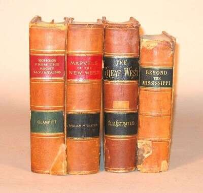The American West - History, Description & Travel: Richardson, Albert D. Beyond The Mississippi. Hartford, etc.: Am. Pub. Co., (1869). Lg. 8vo, orig. sheep; worn & rubbed, spine starting to detach. Double-page map, wood-engraved plates & text illus. Some internal creasing & spotting. Map creased. See Sabin 70980. * Hayden, F.V. The Great West. Its Attractions and Resources. Bloomington, Ill.: Charles R. Brodix, 1880. 1st ed. 4to, orig. sheep, black morocco spine labels; rubbed & worn, hinges stressed, repaired. Steel-engraved frontis. portrait, wood-engraved plates. * Clampitt, John W. Echoes from The Rocky Mountains. Chicago, etc.: Belford, Clarke, 1889. 4to, orig. sheep, red & green morocco spine labels; scuffed, spine starting to detach. Portrait, full-page & text wood-engraved illus. Internally clean. * Thayer, William M. Marvels of The New West. Norwich: Henry Bill, 1890. 4to, orig. sheep, red & black morocco spine labels; scuffed, spine detaching. Wood-engraved illus.