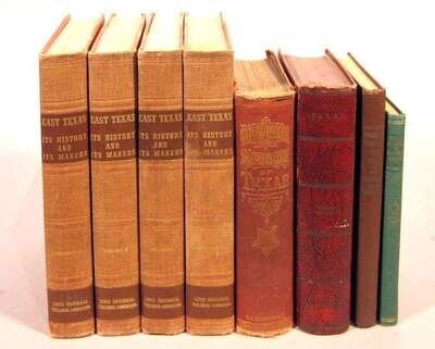 Texas - History & C: Thrall, Homer S. A Pictorial History of Texas. St. Louis: N.D. Thompson, 1879. 5th ed. Lg. 8vo, orig. gilt-lettered & black-stamped terra-cotta cloth, gilt-lettered & decorated spine; moderate wear, extremities frayed. Fold. map (with close tear), full-page illus. * Kennedy, William. Texas: The Rise, Progress and Prospects of The Republic of Texas. Fort Worth, 1925. Lg. 8vo, orig. cloth; some edge wear. With 2 fold. maps. (Reprinted from the 2nd ed., London, 1841.) * White, Dabney; Richardson, T.C. East Texas: Its History and Its Makers. New York: Lewis Historical Pub. Co., (1940). 4 vols. 4to, orig. russet cloth; spines slightly faded, occasionally scuffed. Frontis. & other portrait plates, other plates & text illus. * Dixon, Sam Houston. Romance and Tragedy of Texas History. Houston, (1924). Vol. 1. 8vo, orig. gilt-lettered brown cloth; light wear. Illus. * Whitehouse, Elia. Texas Flowers in Natural Colors. Austin: Texas Books, (1936). 12mo, orig. gilt-lettered & pictorial green cloth; minor wear. Color frontis. & text illus. Signed by the author on front free endpaper recto.
