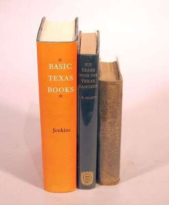 Texas: Arrington, A.W. The Rangers and Regulators of The Tanaha:... A Tale of The Republic of Texas. New York: Robert M. De Witt, (1856). 1st ed. 12mo, orig. blind-stamped green cloth, gilt-lettered & decorated spine; moderate wear. With frontis. + 6 plates. Occasional light foxing & spotting. 10 pp. pub. cat. at back. Howes A-340; Sabin 21080. * Gilbert, James B. Six Years With The Texas Rangers, 1875 to 1881. New Haven: Yale Univ. Press, 1925. 2nd ed. 8vo, orig. blue-black cloth, gilt-lettered spine; light wear. With 12 plates, incl. frontis. Internally clean. Howes G-177; Adams 417; Jenkins 76a. * Jenkins, John H. Basic Texas Books: An Annotated Bibliography. Austin, (1983). 4to, orig. cloth, d/j. Plates. VG+/NF-.