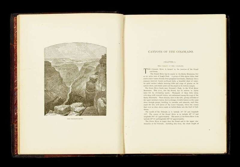 Powell, J.W. Canyons of The Colorado. Meadville, Pa.: Flood & Vincent, The Chautaqua-Century Press, 1895. 4to, orig. gilt-lettered spine & corners. With frontis. portrait, double-page panoramas, full-page half-tone views, numerous wood-engraved full-page & text illus. Complete, internally generally clean. Close tear to pp. 247/248 - no paper loss. Ex-library copy -pocket on front paste-down, label & bar code on front free endpaper recto, ink deaccession stamp in 1/2 title, fore-edge & verso of free back endpaper.