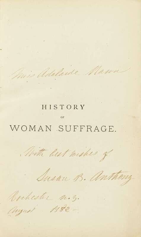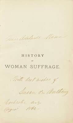 Presentation copy, inscribed to Miss Adelaide Mann, dated, "August 1882," & signed by Susan B. Anthony on 1/2 title of vol. 1 & front blank of vol. 2. Inscriptions & signatures clean & clear.