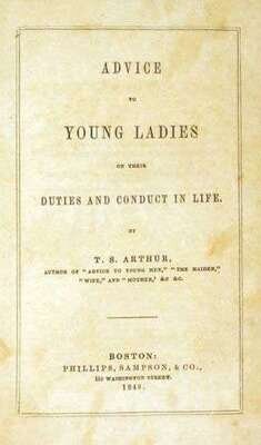 Arthur, T.S. Advice to Young Ladies on Their Duties and Conduct in Life. Boston: Phillips, Sampson, 1849. 12mo, orig. richly gilt paneled & floral green cloth, spine richly gilt, a.e.g.; occasional light wear, spine ends very slightly frayed, a few small chips in cloth at spine ends. Frontis., 5 pp. pub. cat. at end. Moderate foxing to frontis., light to moderate foxing to title page, very scattered, minor internal foxing.