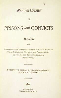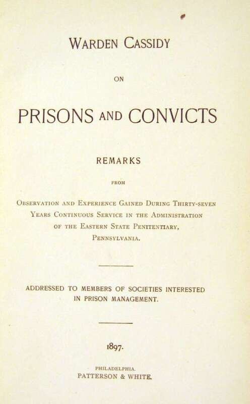 Cassidy, (Michael J.). Warden Cassidy on Prisons and Convicts. Philadelphia: Patterson & White, 1897. 8vo, orig. maroon cloth, gilt-lettered spine; light wear. Frontis., 1/2 tone photo & other plates.