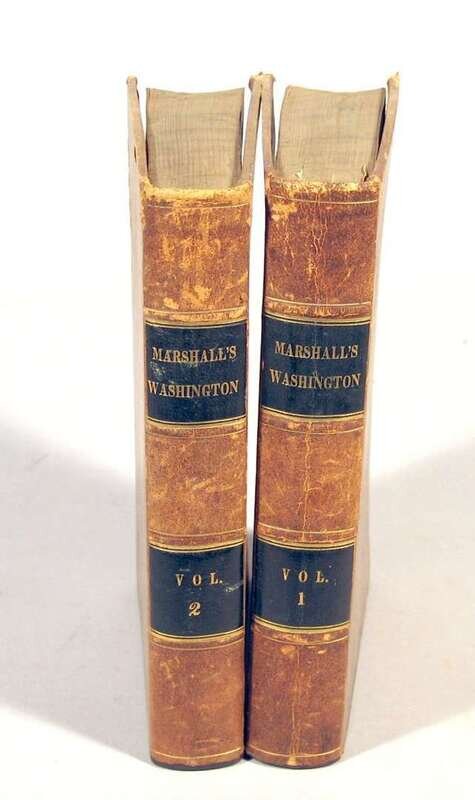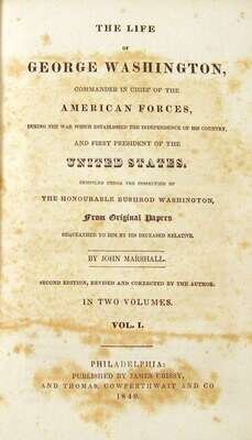 Marshall, John. The Life of George Washington. Philadelphia: James Crissy and Thomas Cowperthwait, 1840. Second Edition, Revised and Corrected by The Author. Lg. 8vo, orig. sheep, black morocco spine labels, marbled endpapers & edges; occasionally scuffed, extremities occasionally rubbed, dark staining to lower edge of covers. Frontis. portrait of G. Washington. Scattered light foxing, moderate foxing & offsetting to portrait & title page. Abridged ed.