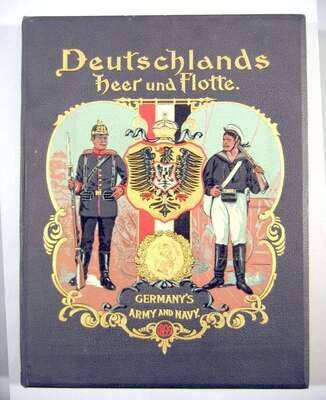 Sigel, Gustav A. Deutschlands Heer und Flotte in Wort und Bild. Akron, Ohio: Werne, 1900. Folio, orig. color & gilt pictorial black cloth, a.e.g.; occasional light edge wear. With 41 chromolithographic plates, lettered tissue guards. Internally generally clean & bright.