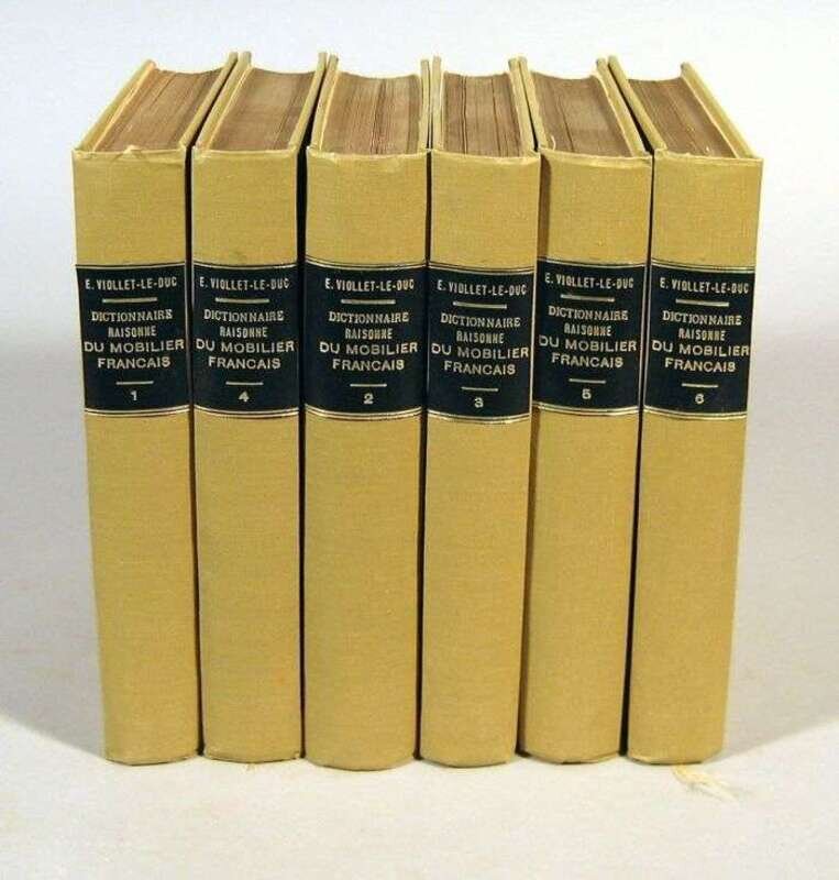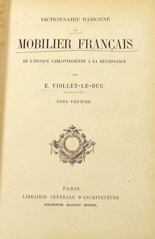 Viollette-Le-Duc, E. Dictionnaire Raisonne du Mobilier Francais, de l'Epoque Carlovinginne a la Renaissance. Paris: Librairie Centrale d'Architecture, n.d. [ca. 1890s]. Lg. 8vo, modern beige buckram, t.e.g.; minor wear. Chromo & plain litho plates, text illus. Internally slightly toned, scattered light to moderate foxing.