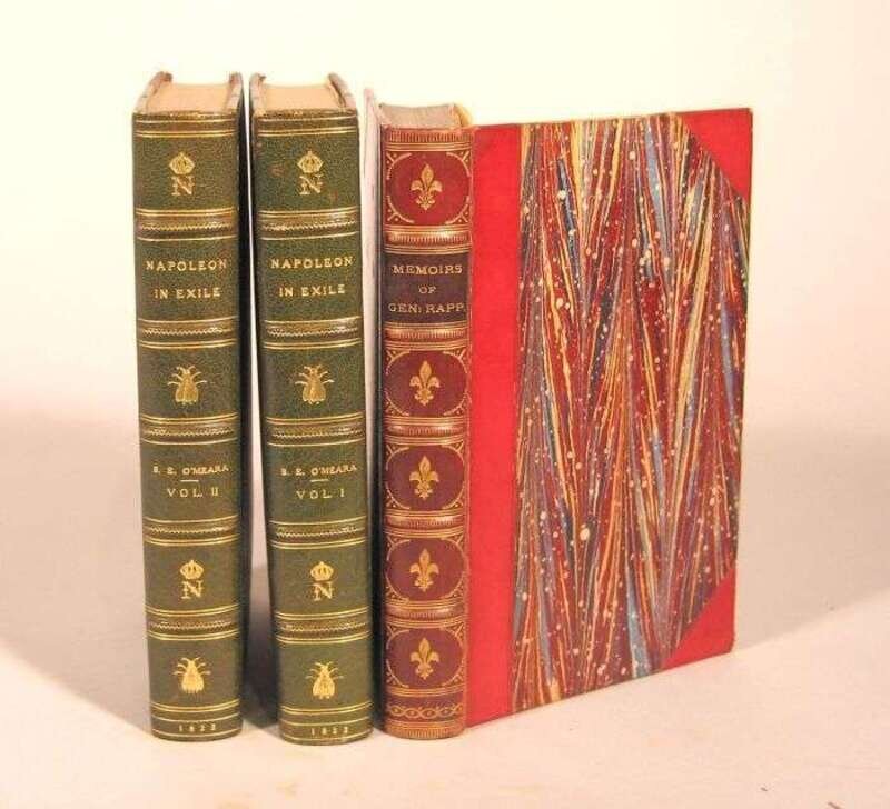 (Napoleon Bonaparte): O'Mera, Barry E. Napoleon in Exile: or, A Voice from St. Helena. London: for W. Simpkin and R. Marshall, 1822. 1st ed. 2 vols. 8vo, early 20th-Century 3/4 crushed green niger morocco & cloth, gilt-lettered & emblematic spines, t.e.g., other edges untrimmed; occasionally lightly scuffed, corners & upper joints a little rubbed, by Brentano's. With 4 plates (2 frontispieces, full-figure portrait - detached, view). Light to moderate foxing - primarily to front matter, 1/2 title in vol. 2 only. Private library ink stamp on dedication page in vol. 1 & head of first page of text in vol. 2. * Rapp, General Count (Jean). Memoirs of... First Aide-de-Camp to Napoleon. London: for Henry Colburn, 1823. 1st ed. 8vo, later 19th-Century 3/4 red calf, marbled bds. & edges, gilt-decorated spine, brown morocco spine label; joints, corners & extremities occasionally slightly rubbed. Frontis. portrait. Internally generally clean.