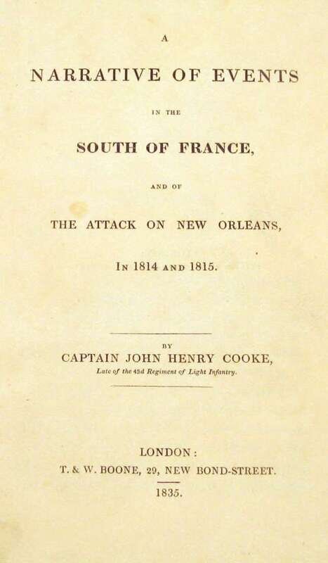 Cooke, John Henry, of The 43rd Regiment of Light Infantry. A Narrative of Events in The South of France and of The Attack... on New Orleans. London: T. & W. Boone, 1835. First edition. 8vo, contemp. 1/4 green calf, marbled bds. & edges, spine richly gilt, maroon morocco spine labels; scuffed, joints & corners rubbed. Minor, very occasional foxing. Without errata slip.