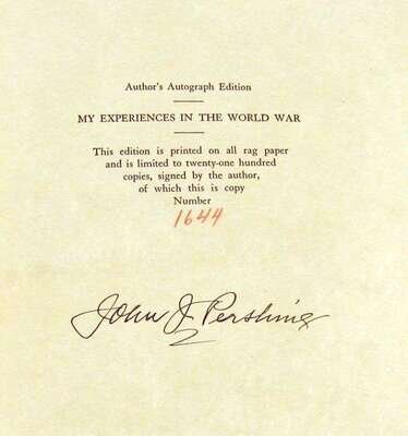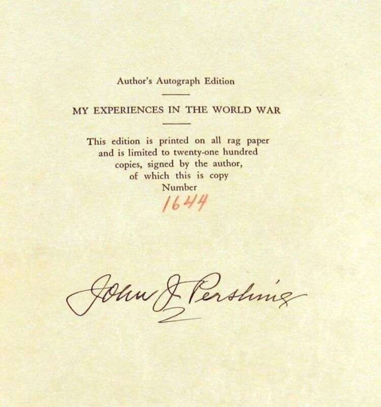 Pershing, John J. My Experiences in The World War. New York: F.A. Stokes, 1931. Author's Autograph Edition, #1644/2100 signed by John J. Pershing. 8vo, orig. olive-green cloth, t.e.g.; spines faded, some spotting. Frontis. portraits, plates, slipcase (worn & soiled).