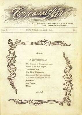 (Periodical Literature.) Compressed Air: Devoted to The Useful Applications of Compressed Air. New York, March, 1896 - Feb., 1897. Vol. 1, nos. 1-12. 8vo, contemp. cloth; moderate wear. Illus., adverts. Internally clean.