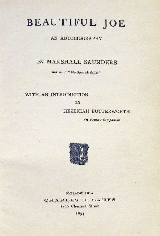 (Dogs.) Saunders, Marshall. Beautiful Joe: An Autobiography. Philadelphia: Charles H. Banes, 1894. First edition. 12mo, orig. gilt-pictorial slate blue cloth; light wear. Frontis., plates, incl. 1/2 tone photo plates. Internally generally clean.